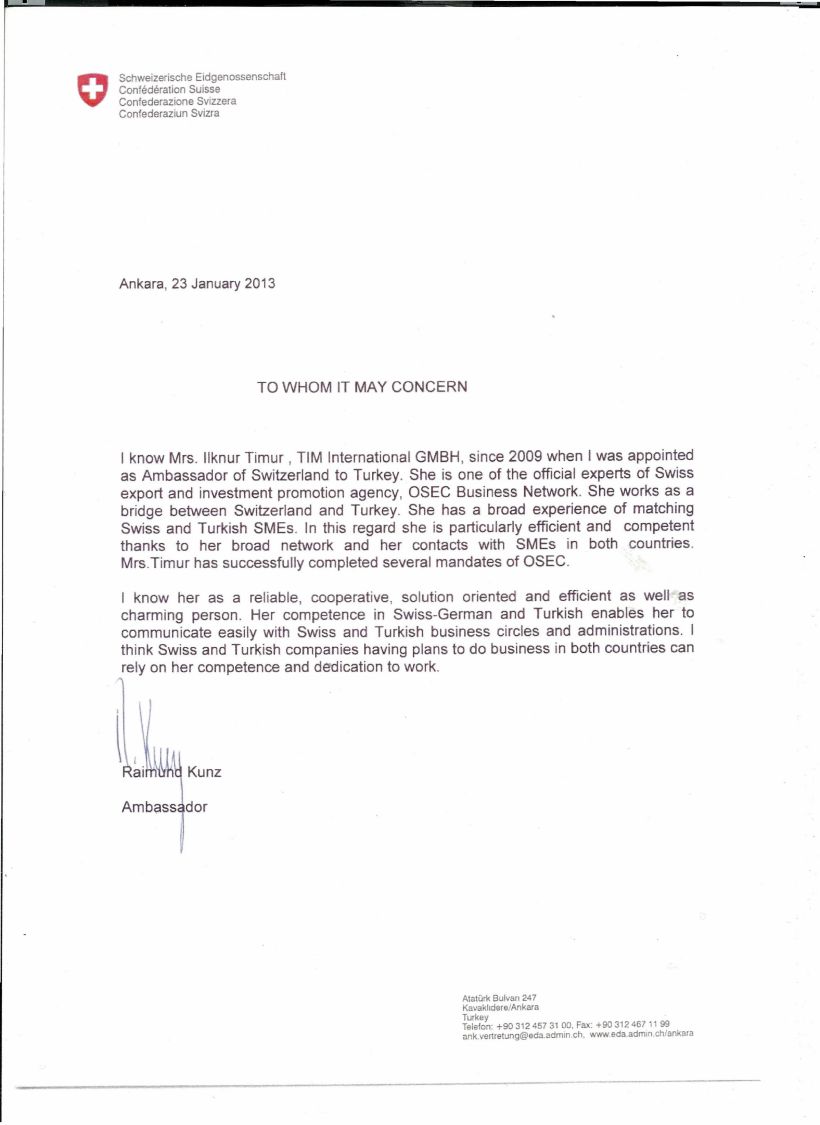 Ankara-İsviçre Büyükelçisi Referans Mektubu
