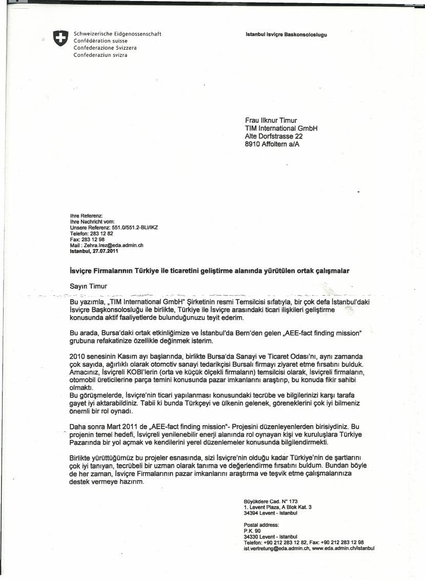 İstanbul-İsviçre Başkonsolosu Referans Mektubu